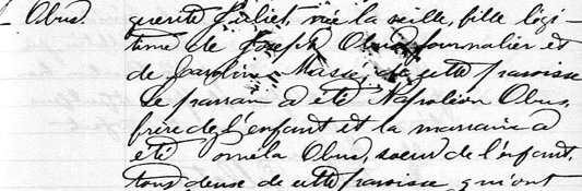 Le vingt-sept février, mil huit cent quatre vingt dix sept, nous, prêtre, vicaire soussigné, avons baptisé Marie Marguerite Juliet fille née la veille du légitime mariage de Joseph Obus, journalier, et de Caroline Massé de cette paroisse. Le parrain a été Napoléon Obus, frère de l’enfant et la marraine a été Paméla Obus soeur de l’enfant tous deux de cette paroisse qui ont déclarer ne savoir signer. Le père absent. Lecture faite.