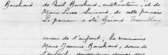 Le neuf janvier mil neuf cent ving sept, nous prêtre rédemptoriste soussigné, avons baptisé Marie Germaine Annette, née la veille, fille légitime de Noël Bouchard, cultivateur, et de Marie Luce Simard, de cette paroisse. Le parrain a été Gérard Tremblay, cousin de l’enfant, la marraine Marie Jeanne Bouchard, sœur de l’enfant, soussignés ainsi que le père avec nous. Lecture faite. [1]