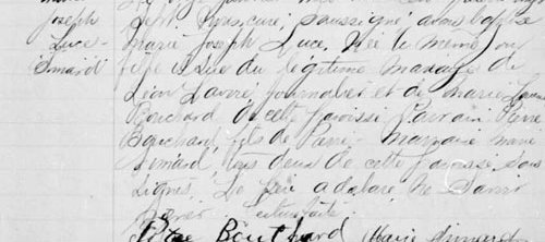 Le onze janvier mil huit cent quatre vingt sept, nous curé soussigné avons baptisé Marie Joseph Luce, née le même jour fille issue du légitime mariage (...)
