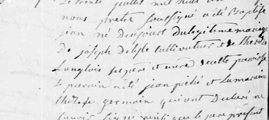 Le trente juillet mil huit cent huit, par nous prêtre soussigné avons baptisé Jean, né du jour du légitime mariage de Joseph Delisle, cultivateur et (...)