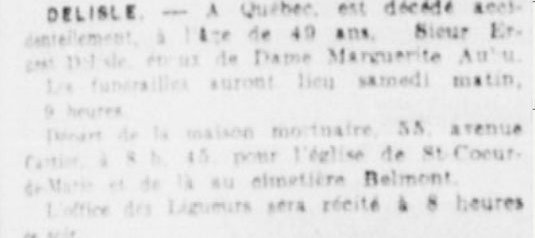 À Québec est décédé accidentellement, à l’âge de 49 ans, Sieur Ernest Delisle époux de dame Marguerite Aubu (sic). Les funérailles auront lieu samedi (...)