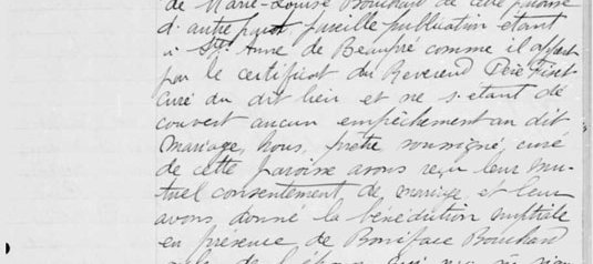 Le dix-sept juillet mil neuf cent onze vu la dispense de deux bans de mariage accordée par sa Grandeur Monseigneur Michel Thomas Labrecque Évêque (...)