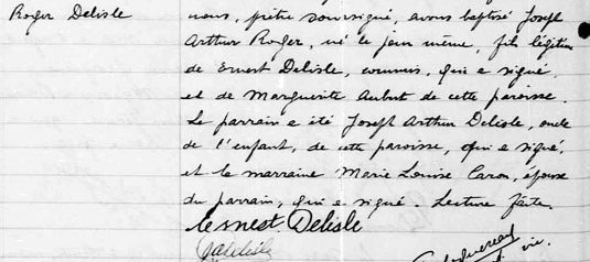Le dix-sept mars mil neuf cent trente nous, prêtre soussigné, avons baptisé Joseph Arthur Roger, né le jour même, fils légitime de Ernest Delisle, (...)