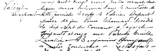 Le 22 mars mil neuf cent cinq, nous prêtre vivant soussigné avons inhumé dans le cimetière de cette paroisse, le corps de Valérie Dupont, épouse de feu Louis Chamard, décédée le 17 du courant, à l’âge de soixante et onze ans. Présents Émile Lavallée, Benjamin Bourgault et autres soussignés. Lecture faite.