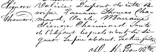 Le vingt-six février mil huit cent soixante-neuf, nous prêtre soussigné avons baptisé Marie-Éléonore née la veille, du légitime mariage de Louis Chamard, cultivateur, et de Valérie Dupont, de cette paroisse. Parrain, Thomas Chamard, Oncle, Marraine Éléonore Chouinard, tante de l’enfant, lesquels n’ont su signer. Le père absent. Lecture faite.