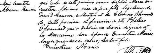 Le 7 juillet mil neuf cent deux nous soussigné curé de cette paroisse avons baptisé Marie-Ernestine Adriane, née ce jour, fille légitime de David Gauvin, cultivateur et de Éléonore Chamard, de cette paroisse. Le parrain a été Philéas Chamard qui a déclaré ne savoir signer et la marraine, son épouse, Ernestine Marier soussignée avec nous : lecture faite. Ernestine Marié.