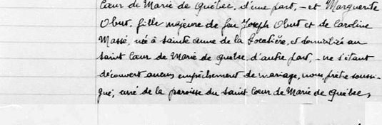 Le trois juin mil neuf cent vingt neuf vu la dispense de deux bans accordée par son Éminence le Cardinal Rouleau en date du vingt-deuxième jour du mois précédent, vu la publication d’un troisième ban faite au prône de notre messe paroissiale en date du vingt sixième jour du mois précédent entre Ernest Delisle, épicier. fils majeur de François Delisle et de feue Philomène Marois, né à Saint-Jean-Baptiste Québec et domicilié au Saint-Coeur de Marie de Québec, d’une part et Marguerite Obut, fille majeure de feu Joseph Obut et de Caroline Massé, née à Sainte-Anne de la Pocatière et domiciliée au Saint-Coeur de Marie de Québec, d’autre part, ne s’étant découvert aucun empêchement de mariage, nous prêtre soussigné, curé de la paroisse Saint-Coeur de Marie de Québec, avons reçu leur mutuel consentement et leur avons donné la bénédiction nuptiale en présence de François Delisle, père de l’époux et Ernest Obut, frère de l’épouse qui ont signé avec nous ainsi que les époux. [1]