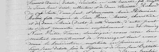Le vingt sept août mil huit cent soixante six, vu la dispense de deux bans pour cette desserte accordé le vingt trois du présent mois par monseigneur De Blois, administrateur de l’archidiocèse de Québec et la publication d’un autre ban au prône de cette église succursale de Saint Jean Baptiste de Québec, entre Sieur François Xavier Delisle domicilié de cette desserte, fils de Sieur Jean Delisle, cultivateur et de Dame Henriette Richard du Cap Santé d’une part et Demoiselle Marie Philomène Marois fille majeure de Sieur Pierre Marois, charretier et de Dame Marie Drolet de cette desserte, d’autre part ne s’étant rencontré aucun empêchement au dit mariage, nous prêtre vicaire soussigné avons reçu leur mutuel consentement de mariage et leur avons donné la bénédiction nuptiale en présence de Sieur Jean Delisle, père de l’époux et de Sieur Jean Baptiste Richard tenant lieu de père à l’épouse, de dame Émilie Marois sa soeur et de plusieurs autres parents et amis dont quelques uns soussignés avec nous.