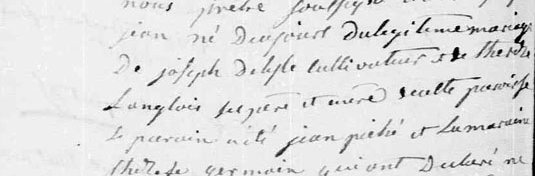 Le trente juillet mil huit cent huit, par nous prêtre soussigné avons baptisé Jean, né du jour du légitime mariage de Joseph Delisle, cultivateur et de Thérèse Langlois 0000 et 000 cette paroisse. Le parrain a été Jean Piché et la marraine Thérèse Germain qui ont déclaré ne savoir signé ainsi que le père présent. [1]