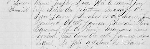 Le onze janvier mil huit cent quatre vingt sept, nous curé soussigné avons baptisé Marie Joseph Luce, née le même jour fille issue du légitime mariage de Léon Simard, journalier, et Marie-Louise Bouchard de cette paroisse. Parrain Pierre Bouchard fils de Pierre, marraine Marie Simard, tous deux de cette paroisse soussignés. Le père a déclaré ne savoir signer. Lecture faite. [1]