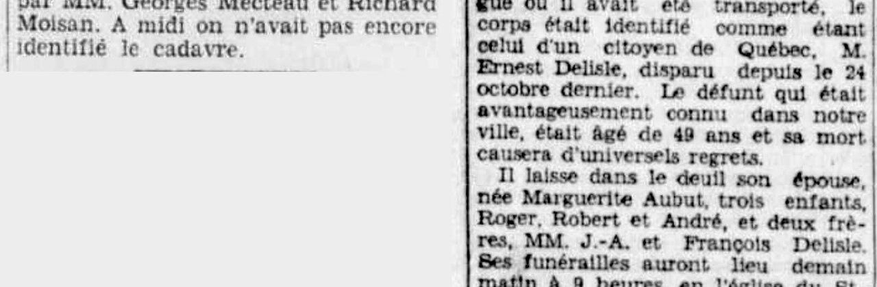 Dans son édition d’hier, Le "Soleil" annonçait qu’un cadavre avait été retiré du fleuve St-Laurent, à l’Anse-au-Foulon. Un peu plus tard, vers la fin de l’après-midi, à la morgue où il avait été transporté, le corps était identifié comme étant celui d’un citoyen de Québec, M. Ernest Delisle, disparu depuis le 24 octobre dernier. Le défunt qui était avantageusement connu dans notre ville, était âgé de 49 ans et sa mort causera d’universels regrets.