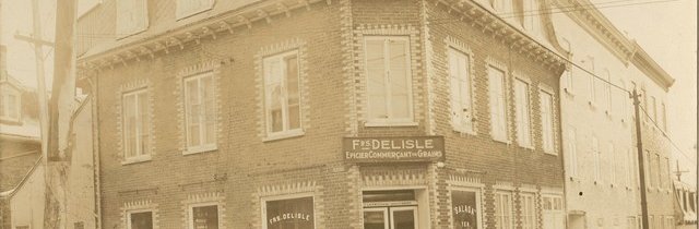 Il s’agit d’une photographie représentant les propriétaires et les employés posant devant l’épicerie Frs. Delisle situé à l’intersection des rues Scott et Plessis. Il s’agit de Mr. F. Delisle P., Mr. F. Delisle G., MR. M. Bouchard, Mr. L. Bleaut, Mr. Labrecque, Mr. L. N. Langlois. On voit un traîneau tiré par un cheval et quelques enfants à gauche de l’image.